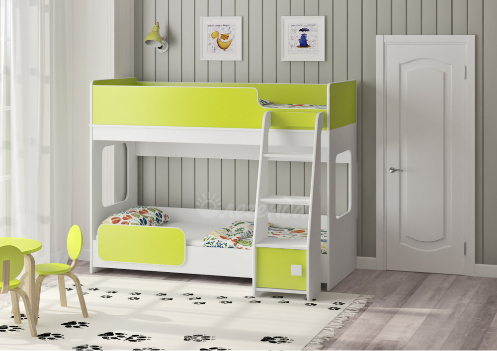 Нижний ярус имеет реечное дно.По вашему желанию нижний ярус кровати можно оснастить бортиком безопасности.