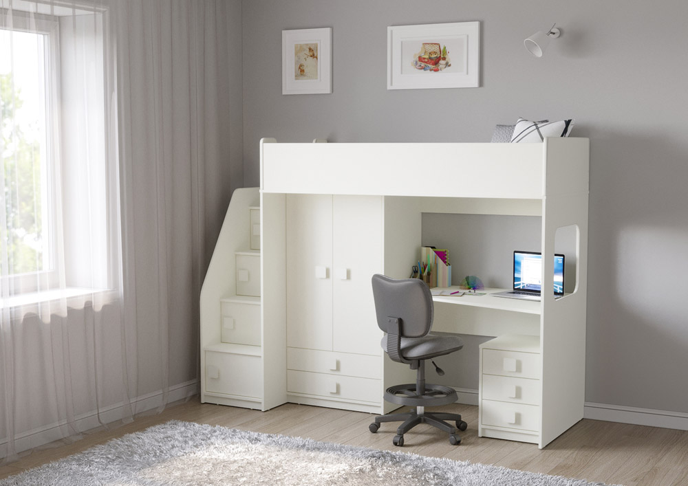 Учебная зона со столом под спальным местом открывает возможности для письменных работ,а также здесь удобно расположить ноутбук. Вместительная тумба Л-04 отлично подойдет для хранения канцелярских принадлежностей и учебников.